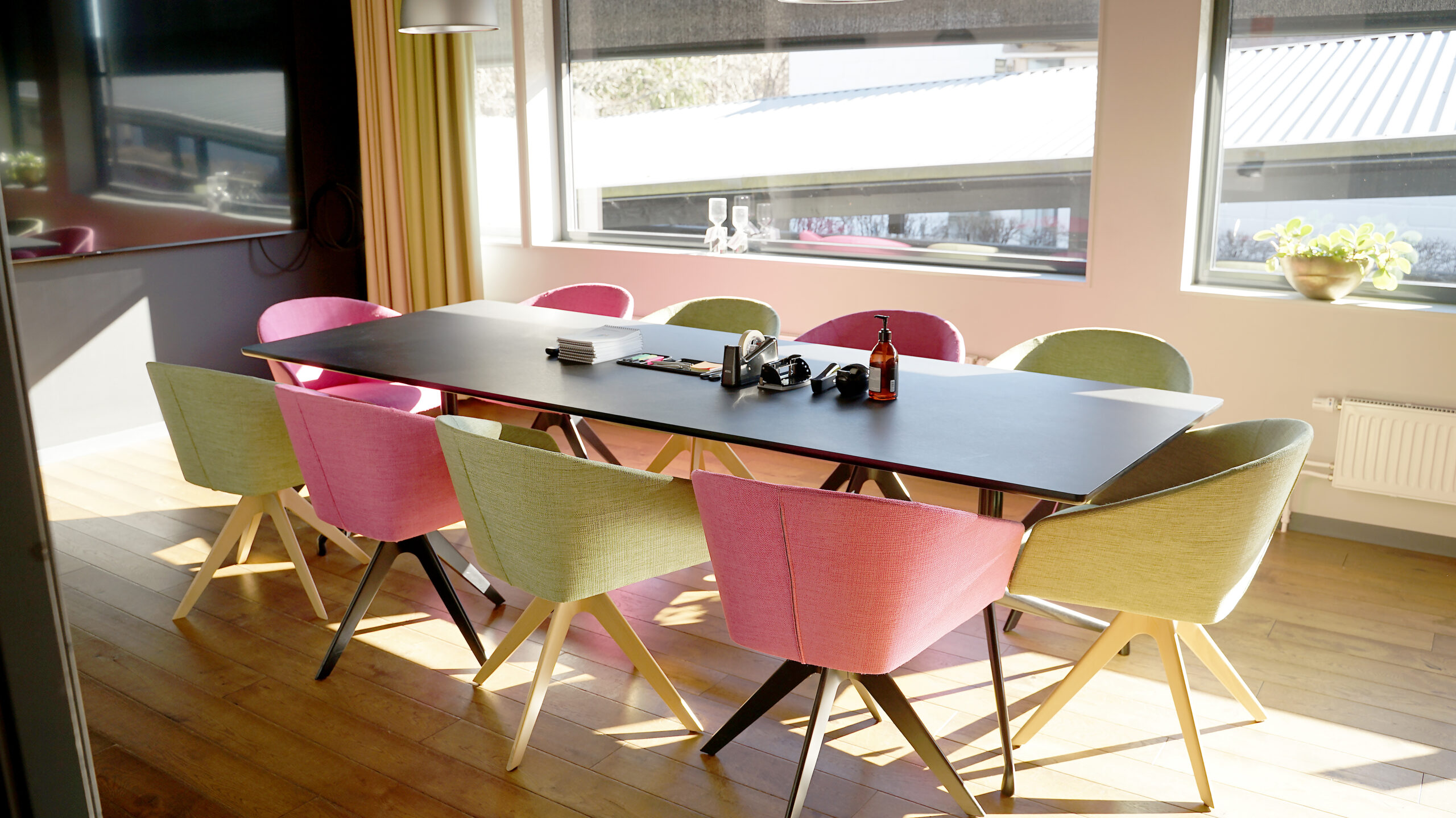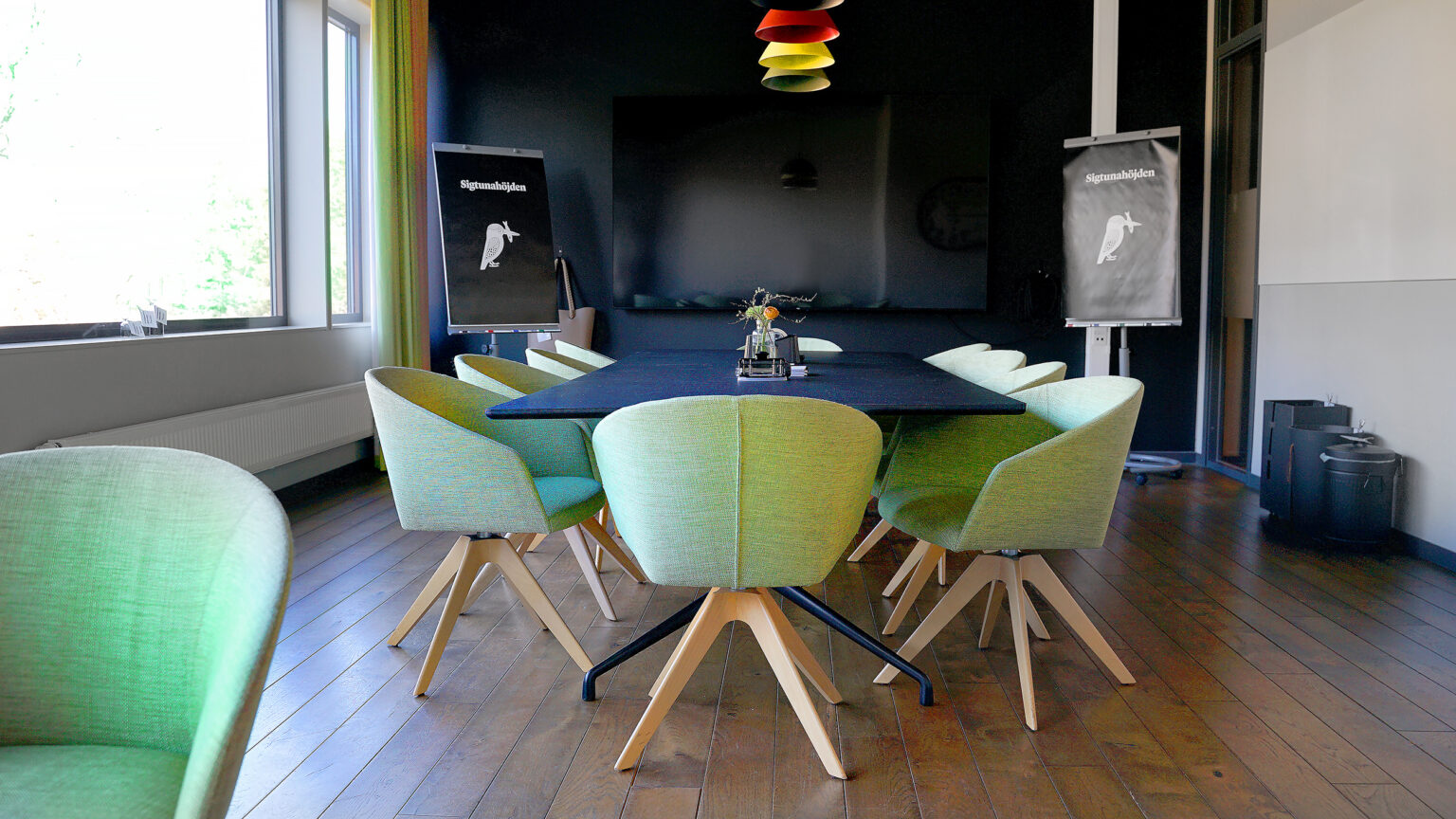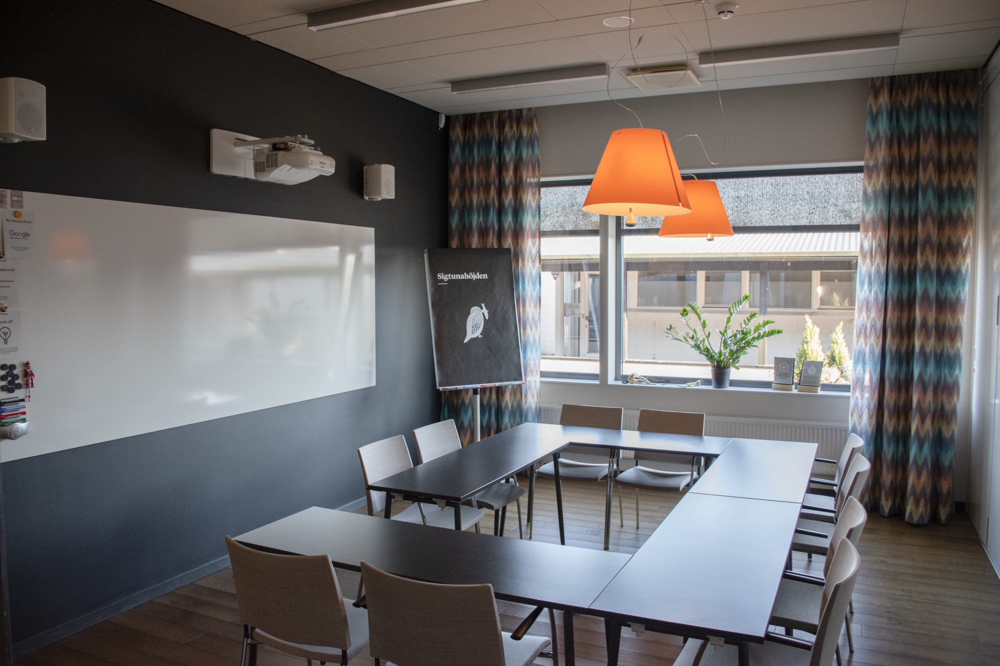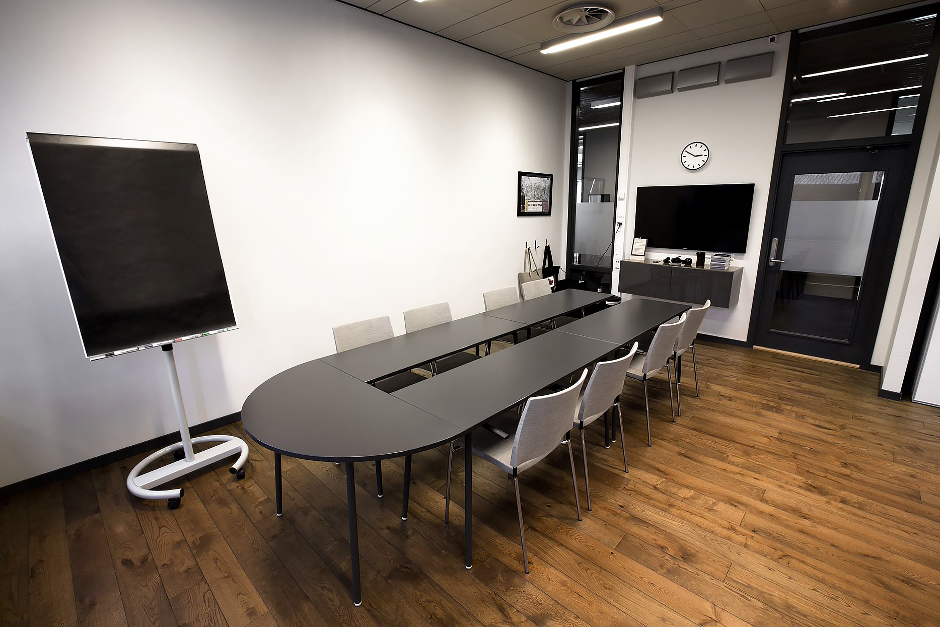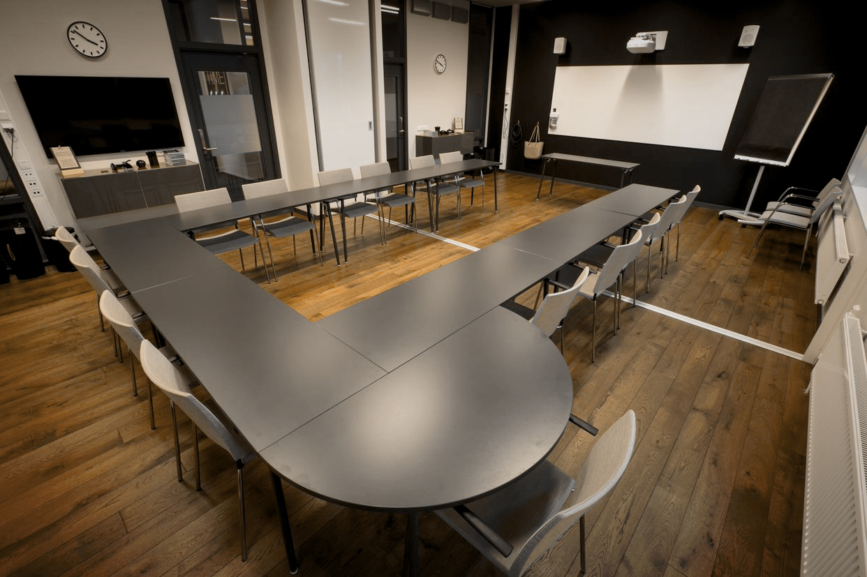 - Vägghängda Bose-högtalare för ljud från både presentation och mikrofoner.