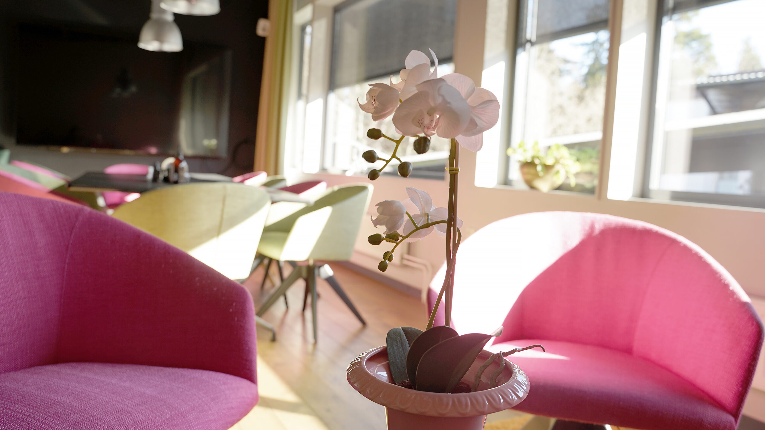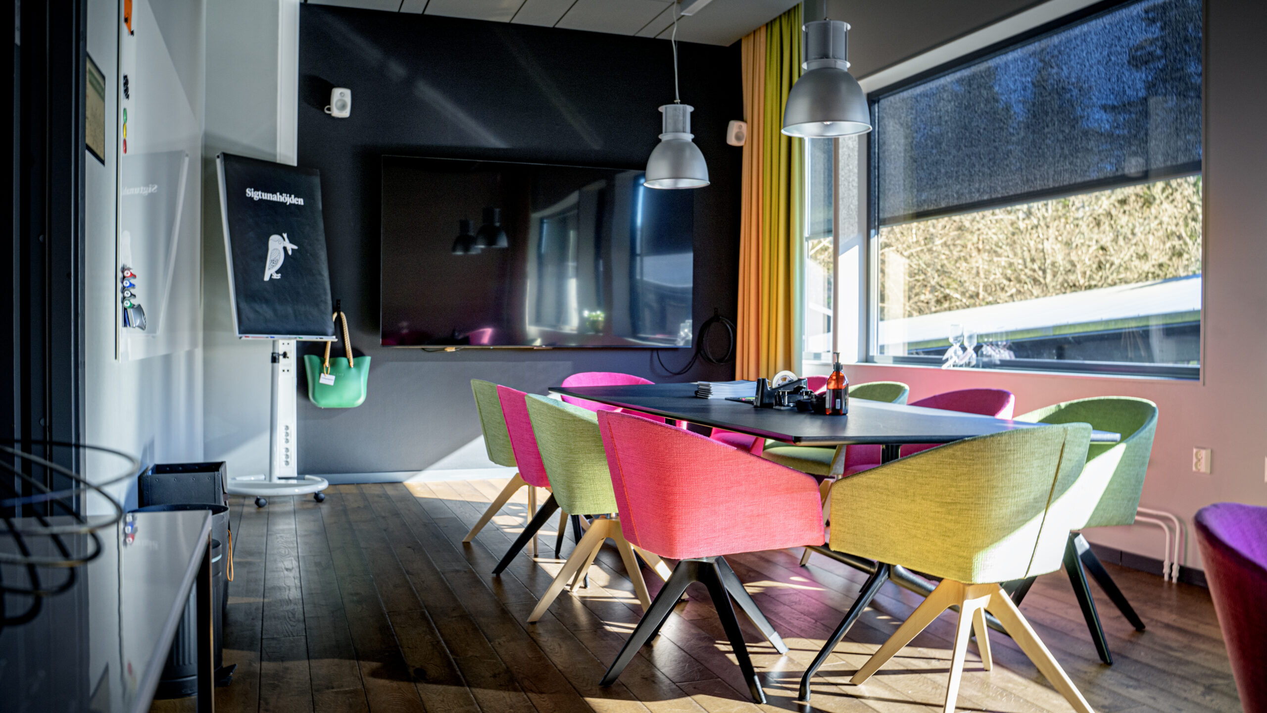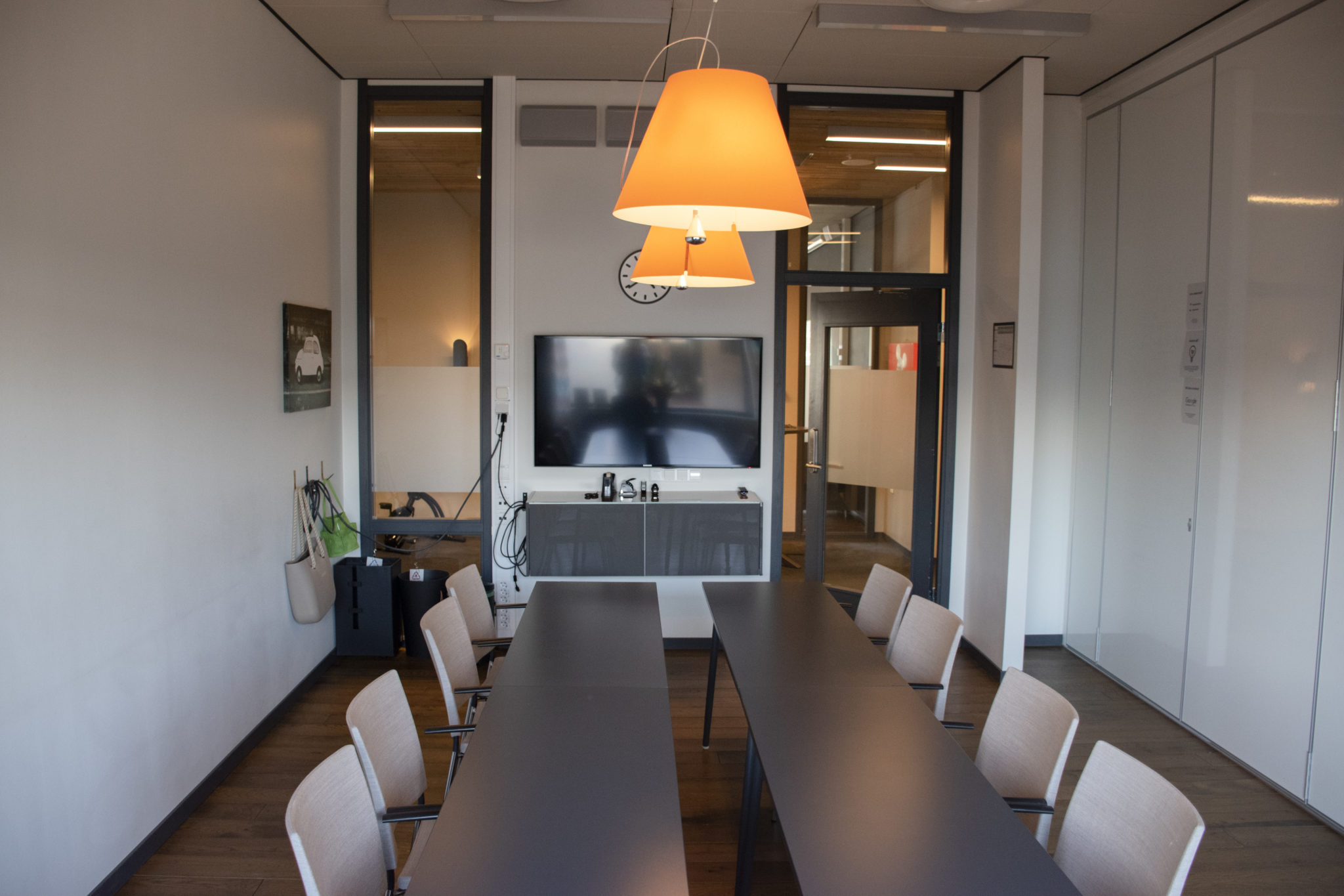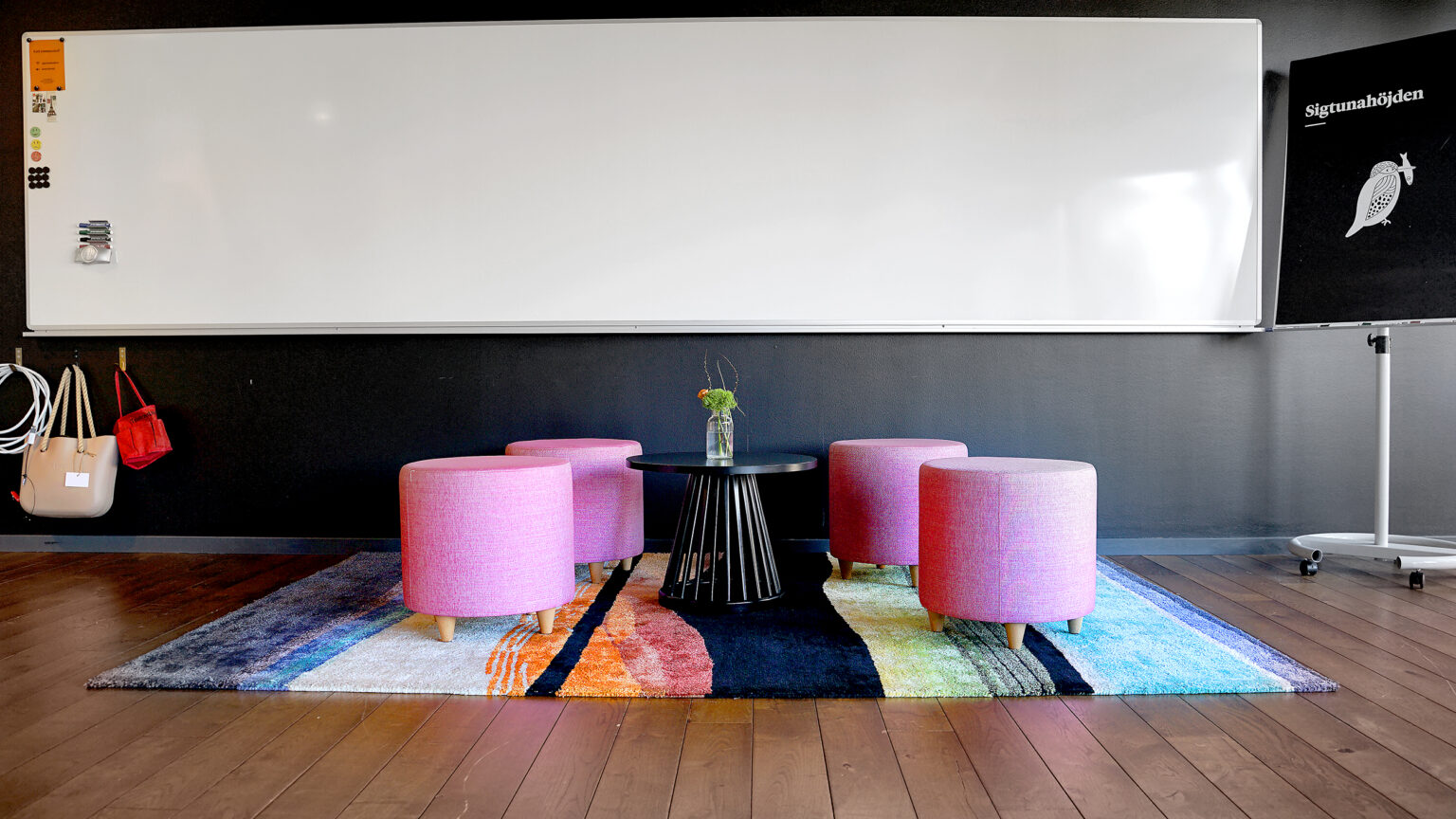 - Vägghängda Bose-högtalare för ljud från både presentation och mikrofoner.